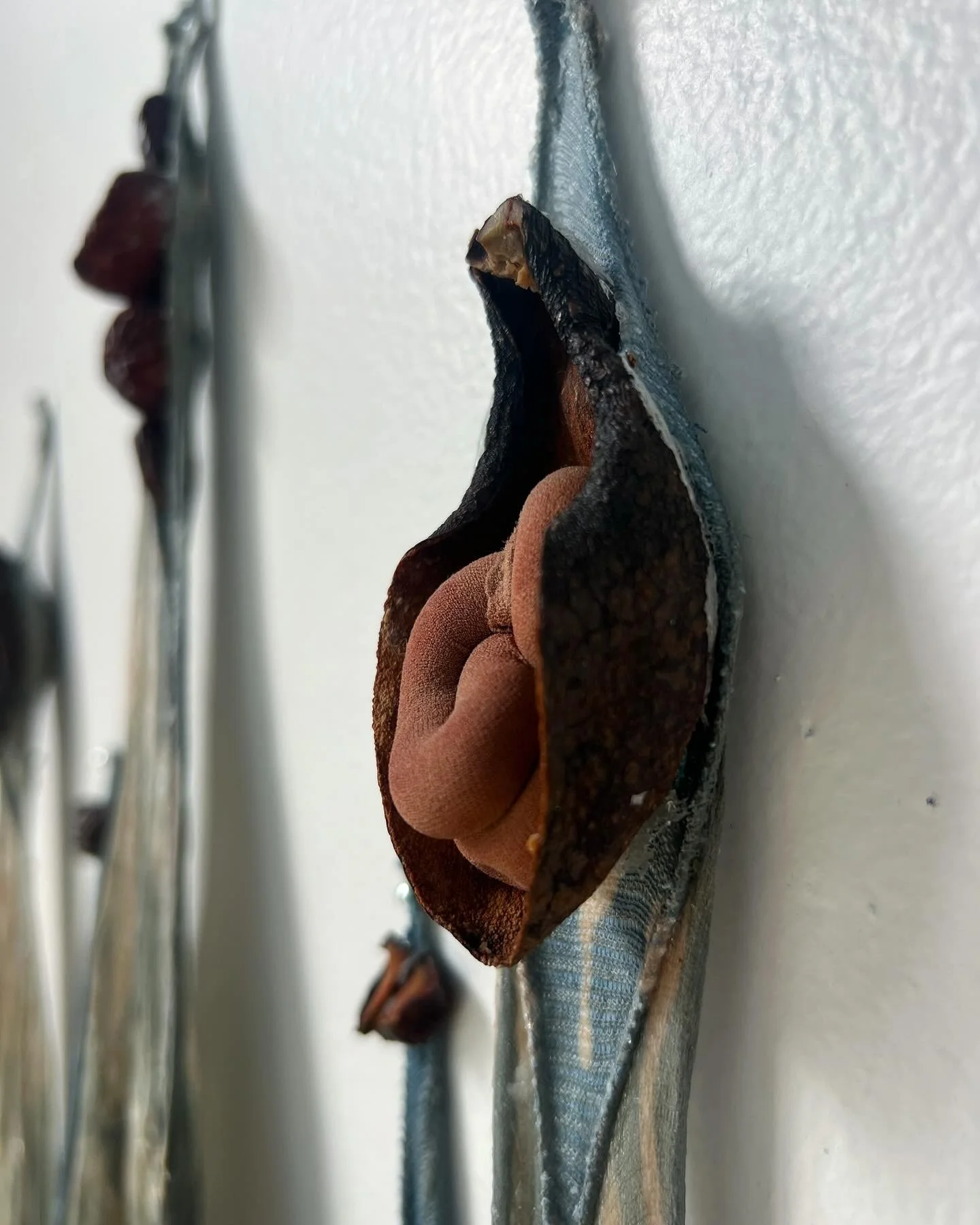 Grafting Guardians, 2025, Nylon, bioplastic, avocado skins/ seeds, wax, indigo