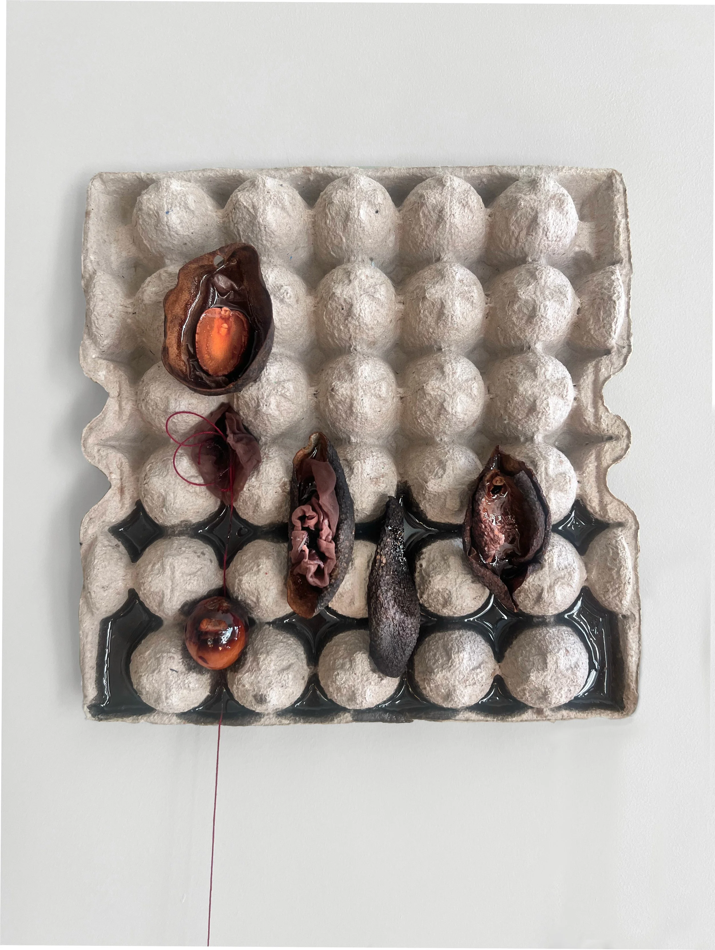 Miscarriage (by Public Transport), 2025, egg carton, avocado skins, seeds, nylon, resin, thread